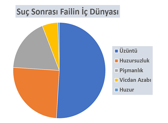 Suç öncesi ile ilgili olarak bu kadar yeter. Gelelim suç sonrası aşamasına. İzzet Durak, cezaevlerinde 600 hükümlü ile yapılan görüşmelerden çıkan sonuçlar çerçevesinde, suç sonrası failin iç dünyasındaki duyguları da rapor etmiş durumda. Buna göre suçlular, suç sonrasında, % 51 oranında üzüntü, % 25 oranında huzursuzluk, % 18 oranında pişmanlık ve % 5,5 oranında vicdan azabı duymaktadırlar. Huzur içinde olanlar ise ancak % 0,5‘tir.
