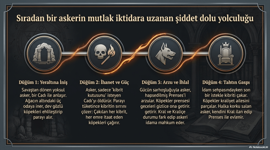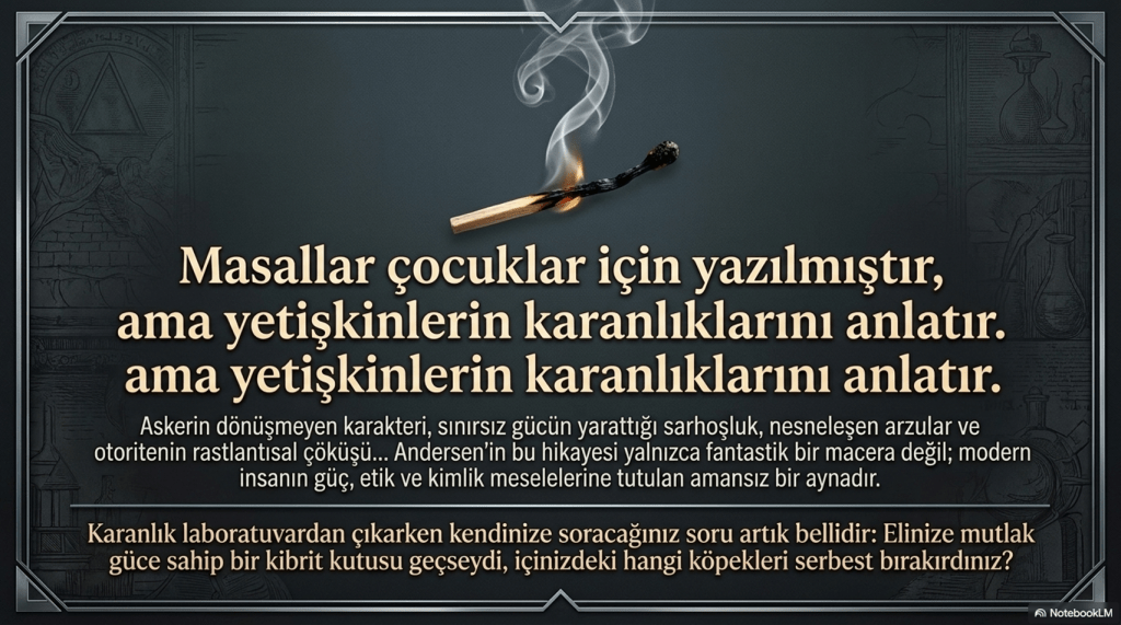 Askerin dönüşmeyen karakteri, kibrit kutusunun sınırsız gücü, prensesin nesneleşmesi ve otoritenin rastlantısal çöküşü… Tüm bunlar Andersen’in masalını yalnızca bir “fantastik hikâye” olmaktan çıkarıp, modern insanın güç, arzu, etik ve kimlik meselelerine bakan bir aynaya dönüştürüyor.