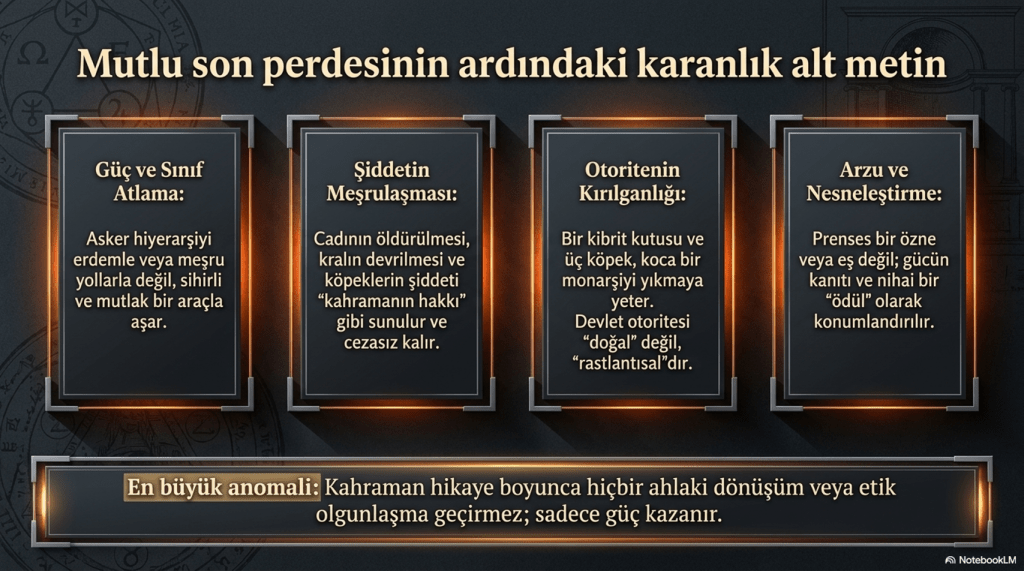 Bu “mutlu son”, aslında masalın karanlık alt metnini daha da çarpıcı hale getirir: asker hiçbir ahlaki dönüşüm geçirmez, sadece güç kazanır.