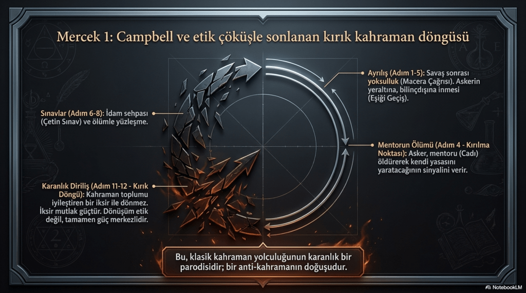 4) Mentor ile Karşılaşma: Cadı, kısa süreli bir mentor figürüdür. Ama asker onu öldürerek mentor figürünü yok eder. Bu, kahramanın ‘kendi yasasını yaratacağı’nın işaretidir.