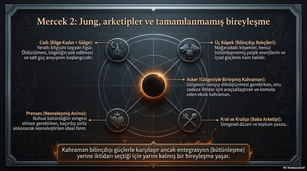 Asker prensesi “görmek” ister; bu, anima ile yüzleşme arzusudur. Ama onu kaçırması, anima’yı nesneleştirmesi anlamına gelir. Bu nedenle asker bireyleşemez; sadece güç kazanır.
