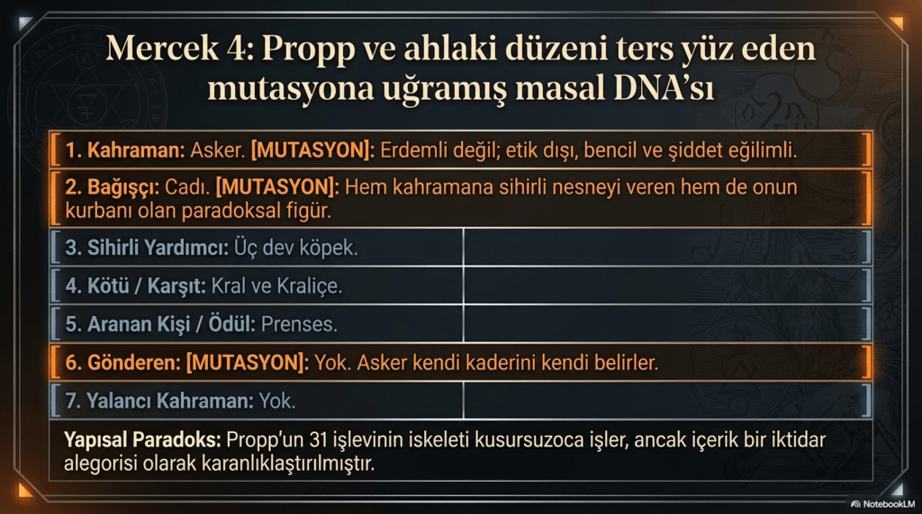 2. Bağışçı aynı zamanda kurban: Cadı hem sınavı veren hem de asker tarafından öldürülen kişidir. Bu, Propp’un modelinde nadir görülen bir kırılmadır.