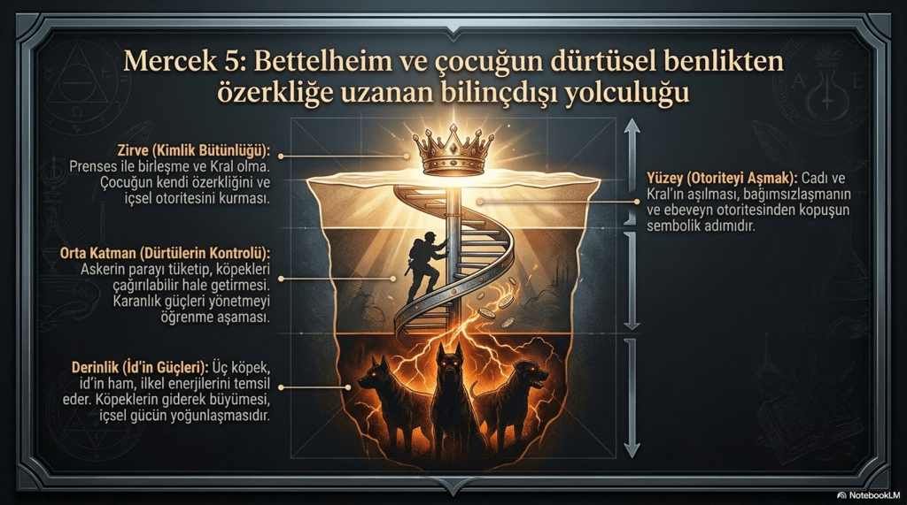 Masaldaki üç köpek, Bettelheim’ın terminolojisiyle çocuğun içsel güçlerinin (id’in ham enerjisinin) üç aşamalı biçimde dışsallaştırılmasıdır.