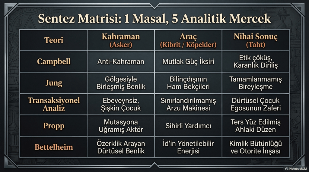 “Kibrit Kutusu”, yüzeyde basit bir yükseliş hikâyesi gibi görünse de, derinlerde insan psikolojisinin, güç arzusunun ve bilinçdışının karanlık kıvrımlarını açığa çıkaran bir laboratuvar gibi işliyor. Campbell’ın döngüsünden Jung’un arketiplerine, TA’nın ego durumlarından Propp’un yapısal iskeletine ve Bettelheim’ın psikanalitik okumasına kadar her model, masalın başka bir yüzünü görünür kılıyor.